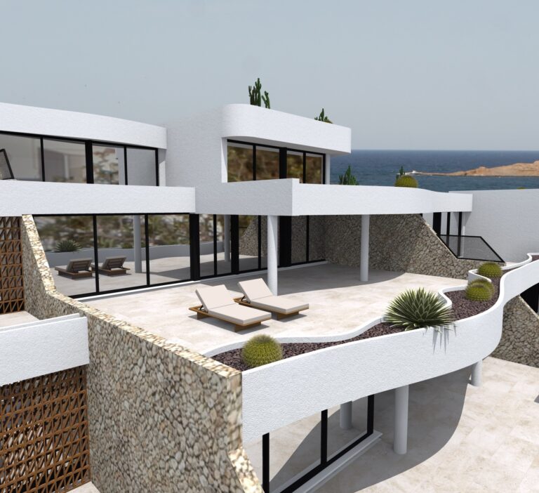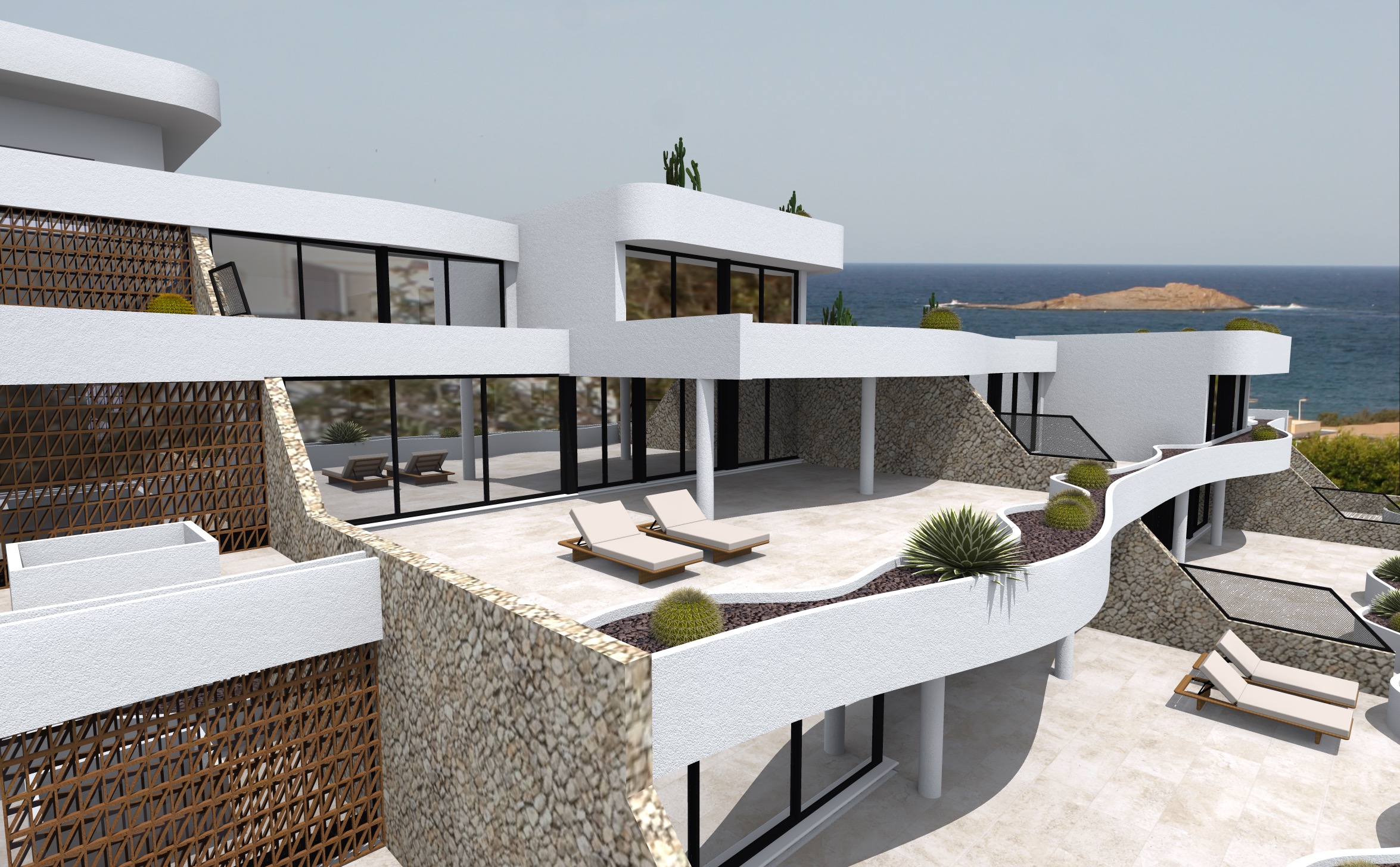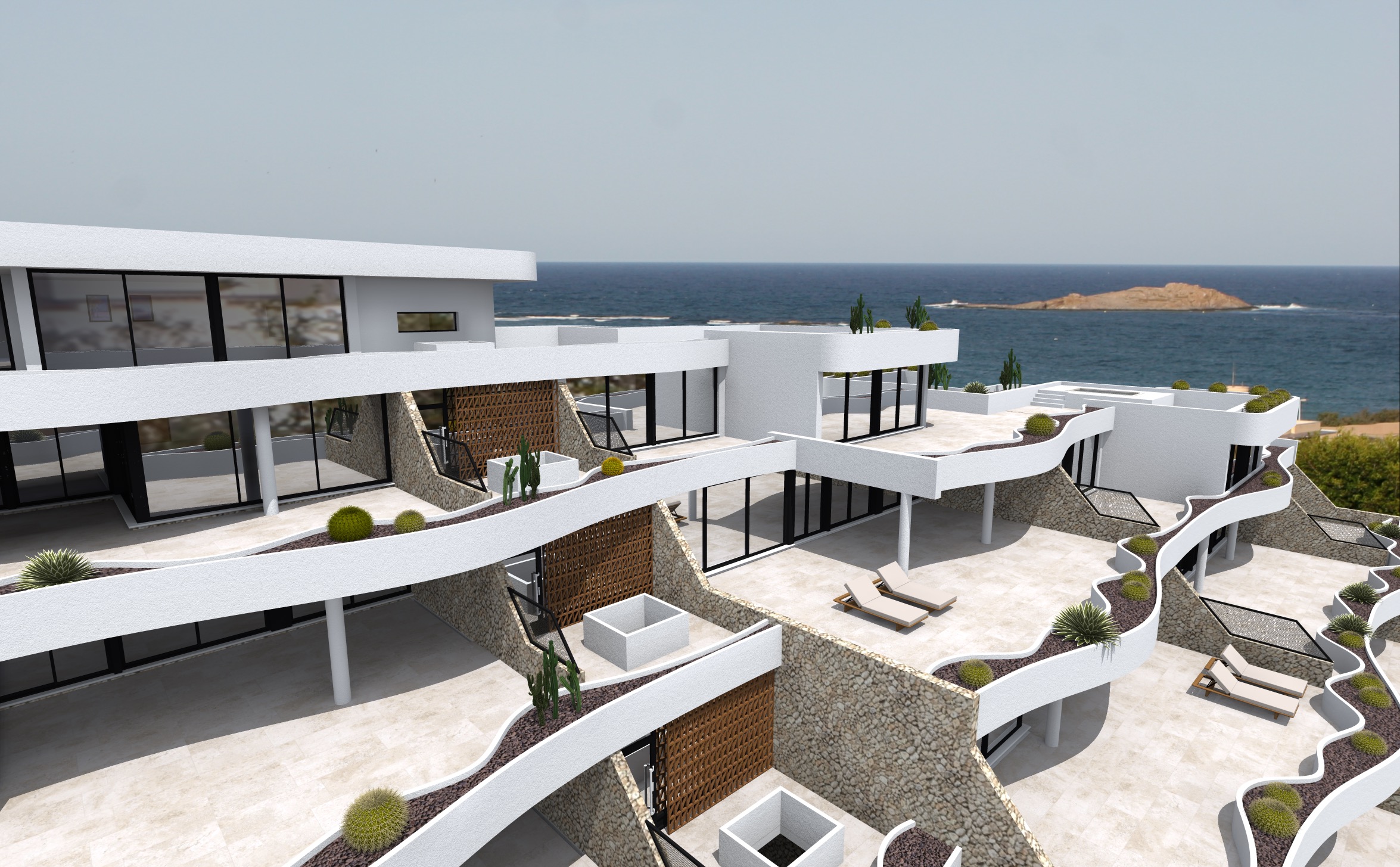 Exclusivo complejo residencial cerrado de 36 viviendas, 73 plazas aparcamiento y 36 trasteros. Viviendas de grandes superficies y terrazas con vistas al mar, jardín semidesértico, piscina climatizada, energía generada por geotermia y solar. PORCELANOSA: Comedor- Distribuidor, Dormitorios, Baños, Cocinas, Terrazas y Zonas Comunes.