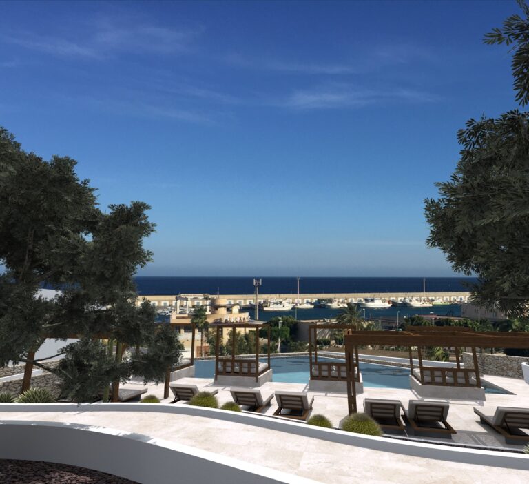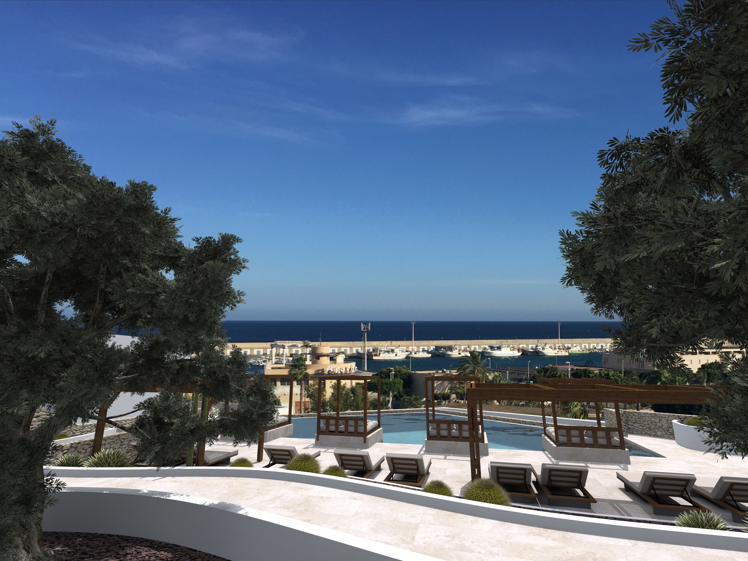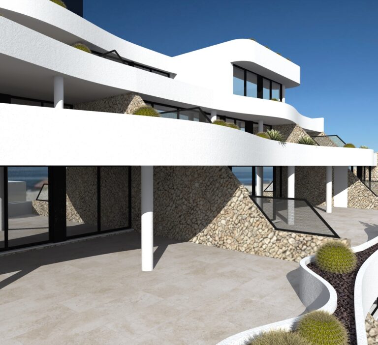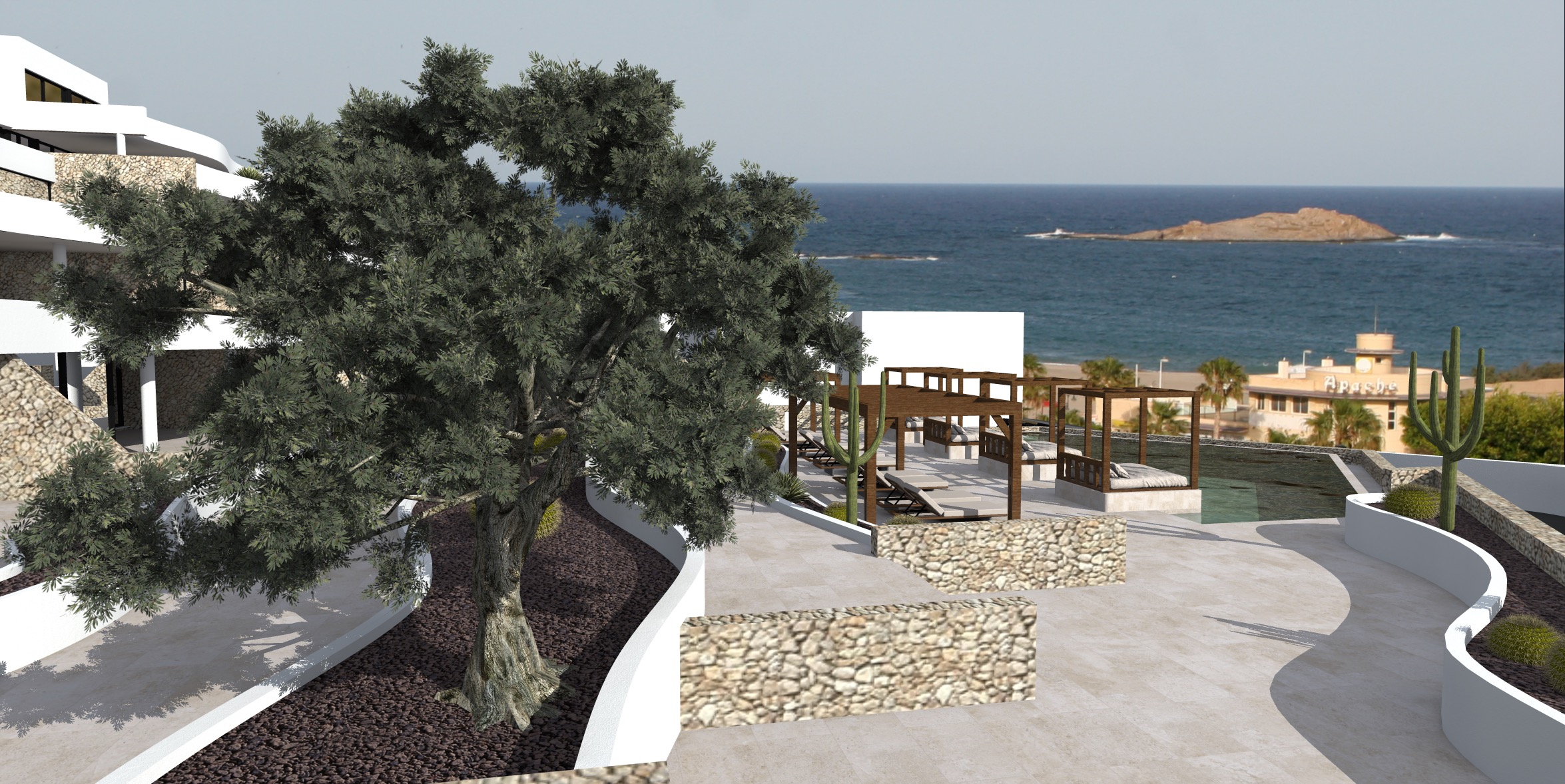 Exclusivo complejo residencial cerrado de 36 viviendas, 73 plazas aparcamiento y 36 trasteros. Viviendas de grandes superficies y terrazas con vistas al mar, jardín semidesértico, piscina climatizada, energía generada por geotermia y solar. PORCELANOSA: Comedor- Distribuidor, Dormitorios, Baños, Cocinas, Terrazas y Zonas Comunes.
